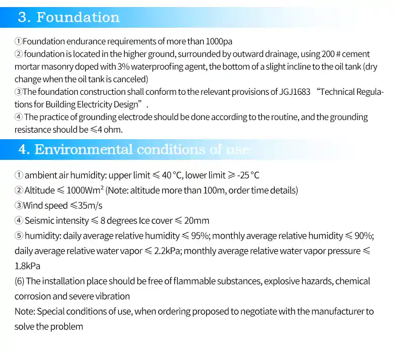 - The foundation should be built on relatively high ground, with external drainage on all sides. Use200# cement mortarmixed with 3% waterproofing agent, and ensure the bottom slopes slightly towards the oil tank (the oil tank is removed when installing a dry-type transformer).
